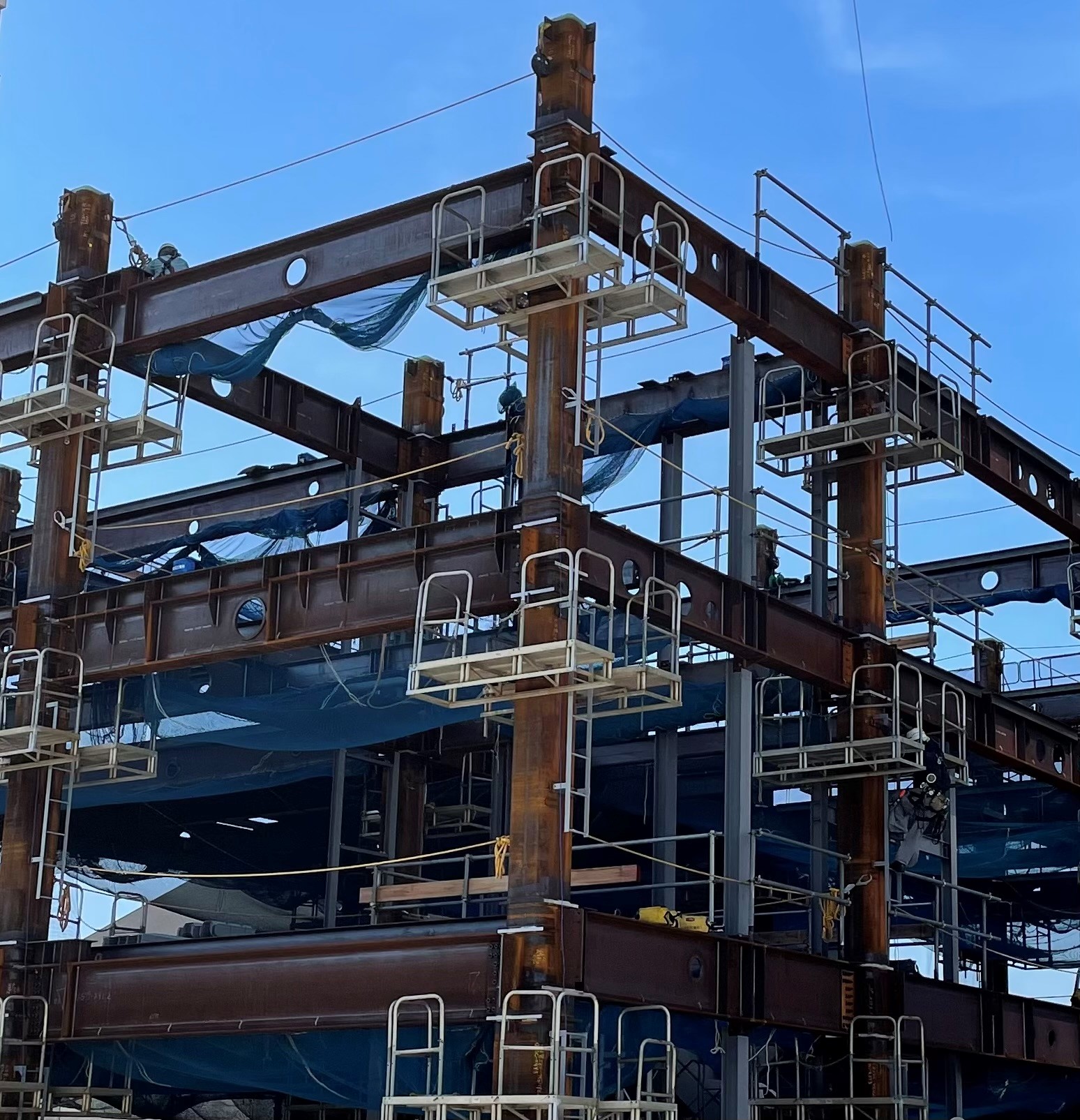 建設現場では、工場で製作された鉄骨をクレーンで持ち上げ、ボルトや溶接で結合して建物の骨組みを組み立てます。